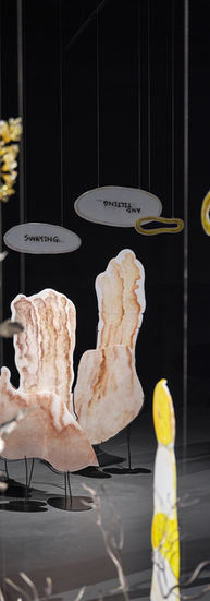 Transparent LED screens, glass and stainless steel sculptures, paintings, custom floor mat, 3D animation, 4K video with sound